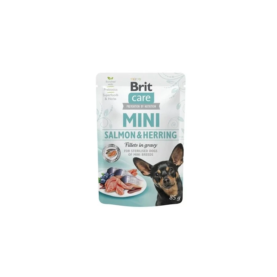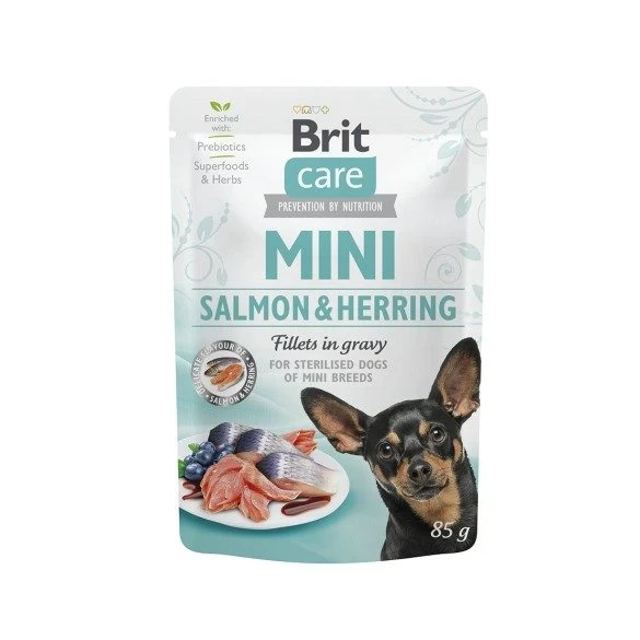 Brit Care Mini egy lazacfilékkel és heringgel teli zacskós eledel ízletes szaftban, kistestű ivartalanított felnőtt kutyák számára.