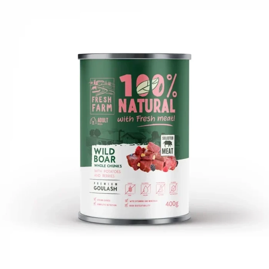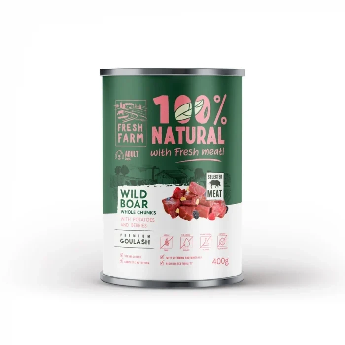 A Fresh Farm Gulyás kiváló választás azoknak a kutyáknak, akik csak a legjobb alapanyagokat érdemlik meg. A 80%-ban vaddisznóhúsból készült termék gazdag fehérjeforrást kínál az aktív életmódhoz. A burgonya és a bogyós gyümölcsök rostokat és esszenciális vitaminokat adnak hozzá, támogatva négylábú barátja emésztési egészségét és immunrendszerét.