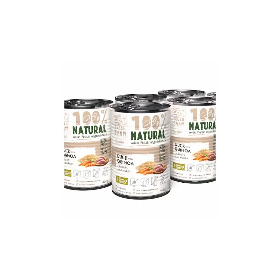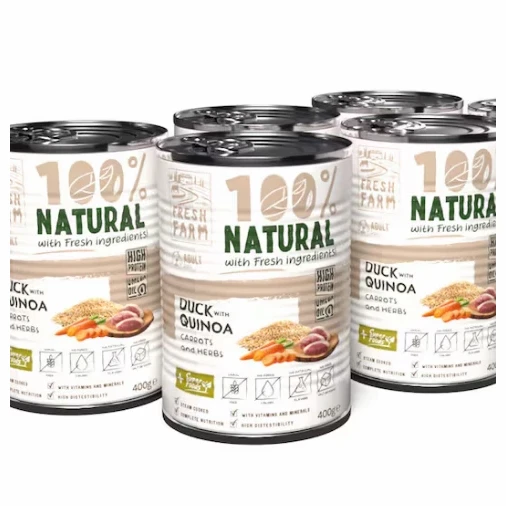 ÖSSZETÉTEL: 25% kacsa, 25% csirke, 8% quinoa, 8% sárgarépa, 2% alma, 1% gyógynövény keverék, 1% lazacolaj, 1% petrezselyem, 0,5% lenmag, 0,2% alga.