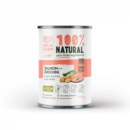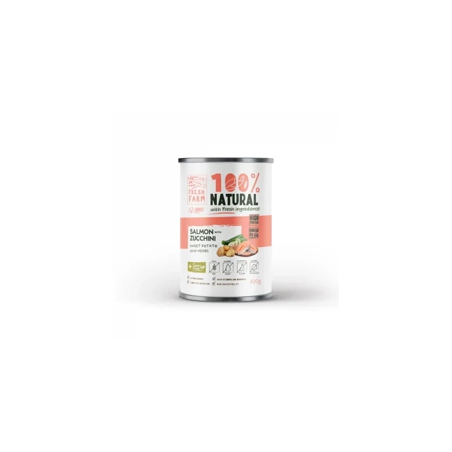 ÖSSZETÉTEL: 25% hal, 20% lazac, 5% halbőr, 6% cukkini, 3% édesburgonya, 2% sárgarépa, 2% bogyók, 1% gyógynövénykeverék, 1% lazacolaj, 1% petrezselyem, 0,5% lenmag, 0,2% alga.