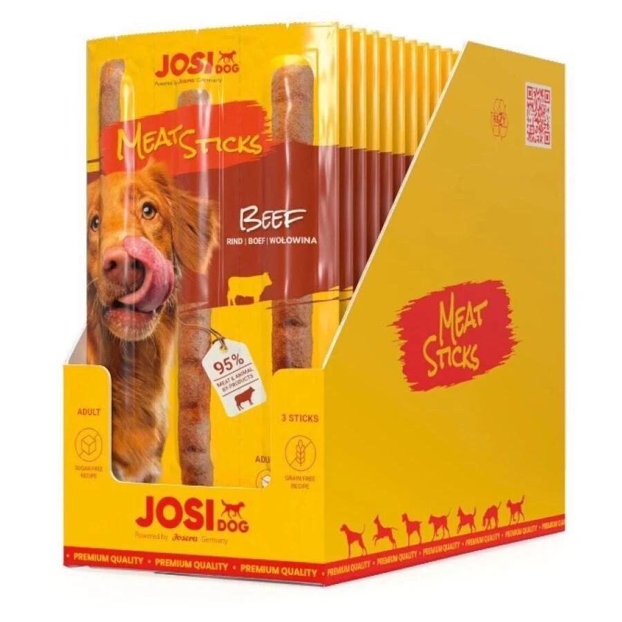 Finom falatok igényes négylábú barátoknak: szaftos húsrudacskák marhahússal kutyák számára A mi marhahúsos JosiDog Meat Sticks jutalomfalatunk ellenállhatatlanul szaftos! Ez a felnőtt kutyáknak készült, szaftos húsrudacska tökéletes választás a kiképzés során dicséretként, a kutya kényeztetéséhez, jutalomfalatként és apró meglepetésként két étkezés között. A pazar íztől és a kellemesen húsos aromától a kutyák szájában összefut a nyál, így a lelkes fogadtatás szinte garantált. Mi, kétlábúak pedig annak örülhetünk, hogy a kutyánk jutalmfalatkái milyen egyszerűen porciózhatók. Bármilyen fajtájú ebnek alkalmas és kistestű kutyáknak is adható. A praktikus csomagolás 3 darab, egyenként lezárt JosiDog Meat Sticks húsrudacskát tartalmaz, és utazáshoz is remek megoldás.