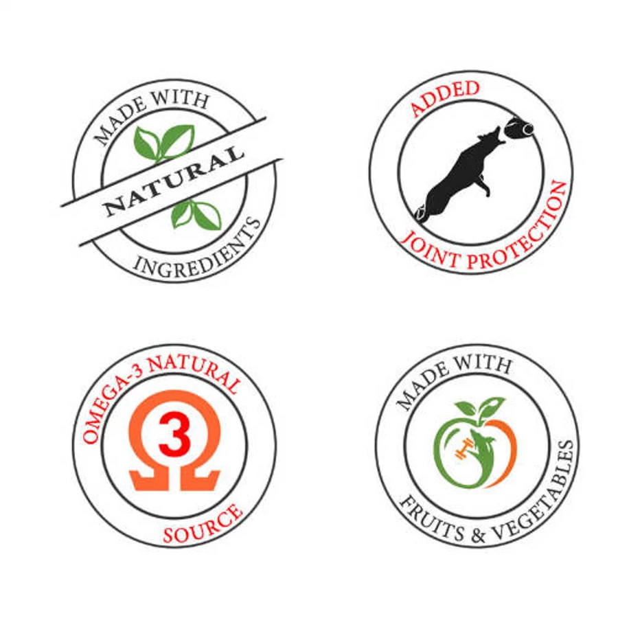 Hús és állati származékok (marha húsliszt 12%, baromfi húsliszt 10%, hal húsliszt 5%, zsír (szárnyasmentes) min. 8%), feltárt kukorica, korpa, rizs, kukoricaliszt, búza, alma, sárgarépa, yucca schidigera kivonat (500 mg/kg).