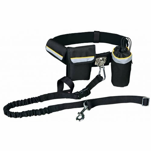 Praktikus sportöv rugalmas pórázzal. Strapabíró nylonból készült. Ideális kocogáshoz, erdei túrákhoz, sportoláshoz, de a napi sétánál is kényelmesnek bizonyulhat. "Hands Free" azaz szabad kezet biztosít a gazdinak, hála a rugalmas derékpántnak. A speciális illesztéseknek (forgatható karabinerek) köszönhetően elkerülhető, hogy a kutya esetleges forgolódásai miatt a póráz a lábunk, vagy kutyánk lába köré csavarodjon. A rugalmas kialakítás miatt ha kutyánk hirtelen megrántja a pórázt, ellasztikusságának köszönhetően a derékövön keresztül nem érezzük olyan erősnek a rántást. Ez a kutya és a gazdi ízületeit is kiméli. Az öv csatja párnázott borítást kapott, hogy semmiképp se nyomódjon használója hátába. Bármikor könnyedén lecsatolható a nagy karabinernek köszönhetően, és egy hurokmarkolattal máris hétköznapi pórázként használható. Az övön található két zseb alkalmas telefon, kulcsok, jutalomfalat és kulacs tárolására is. A fényvisszaverő szegély a nagyobb biztonság nyújt az esti kocogás, futás során.